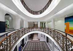 Über den Aufzug erreicht man auf der unteren Ebene den Barbereich. Eine Deckenvoute entlang des Perimeters der Kugel zeichnet die runde Grundrissform nach und blendet die gewölbte Weißbetonschale mit indirektem Licht ein.