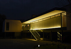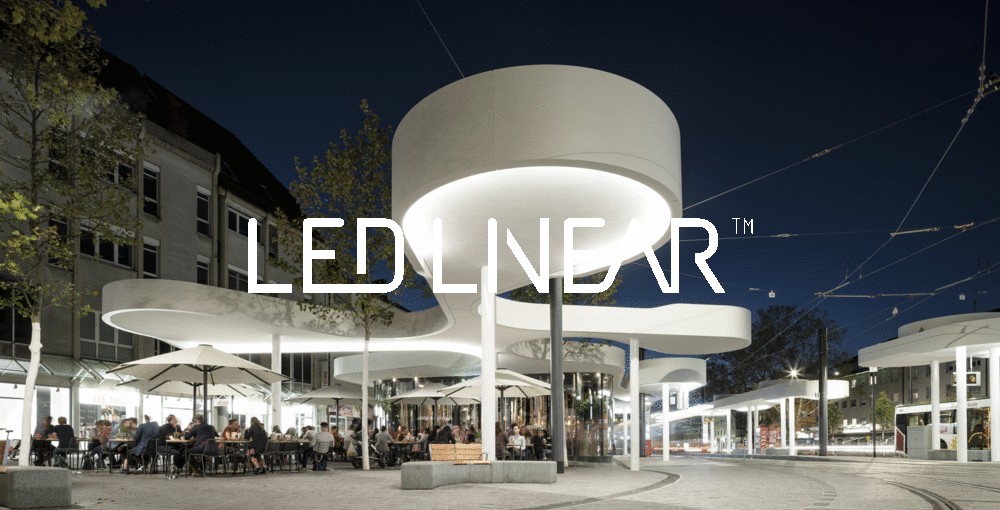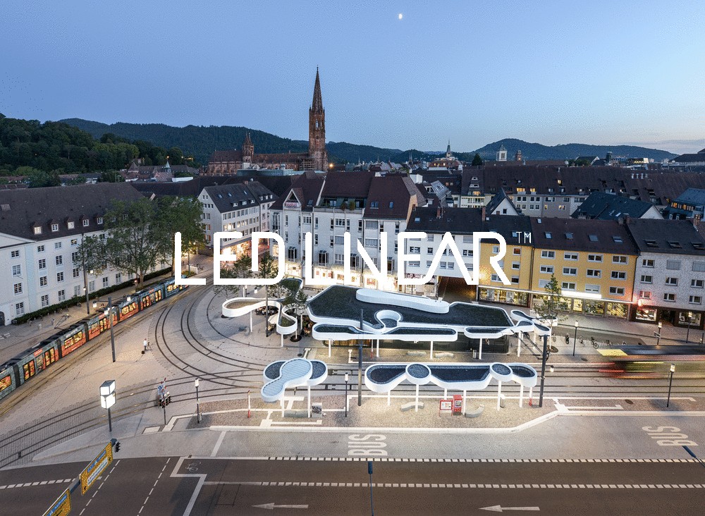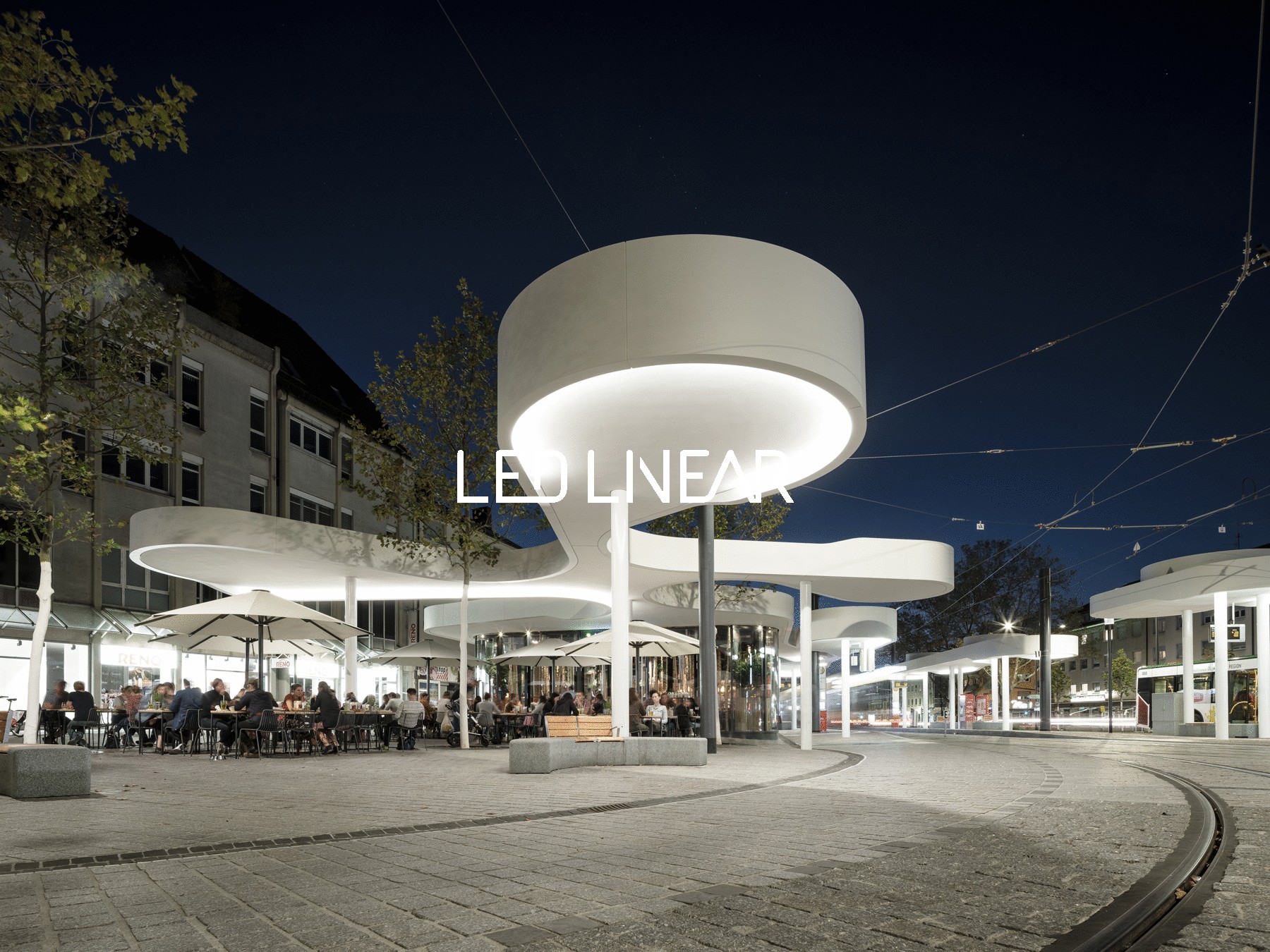 Der Pavillon wird zu einem kommunikativen Ort und Treffpunkt, der die Bedürfnisse des öffentlichen Verkehrs und der städtischen Erfahrung vereint. In der Abenddämmerung und in der Nacht geben die Baldachinplatten ein angenehmes und willkommenes Licht. Hinterleuchtet sind die Platten mit VarioLED Flex™ PHOBOS Top View in 2700 Kelvin.