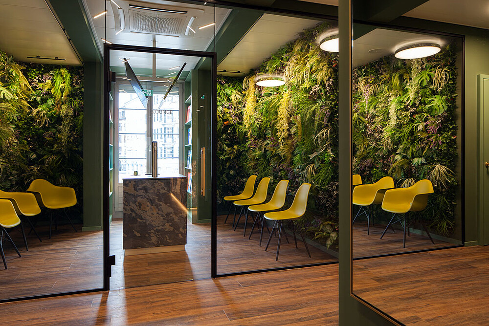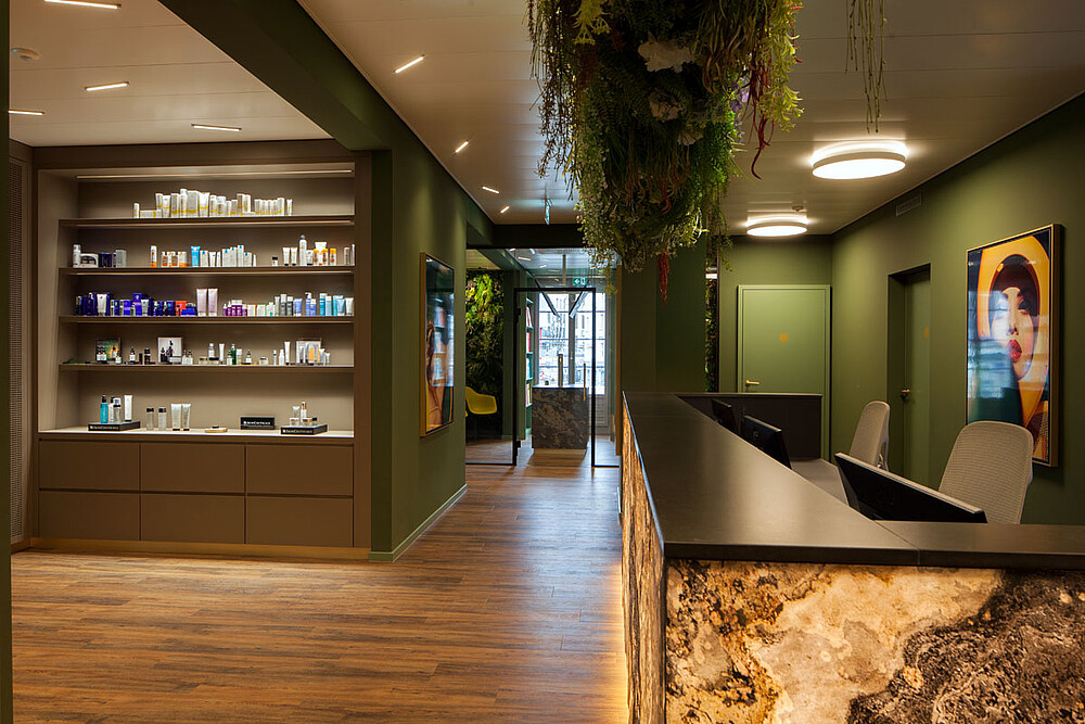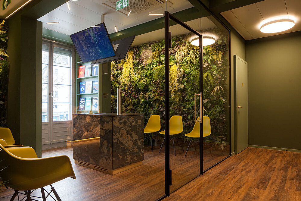 Üppig und großflächig angeordnete Grünpflanzen schaffen ein angenehmes Ambiente. Beruhigende Grüntöne verstärken den Wohlfühlcharakter.