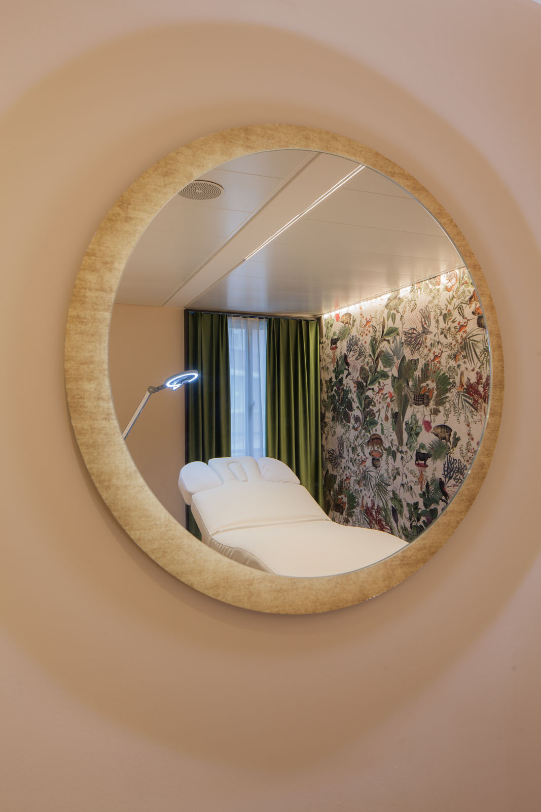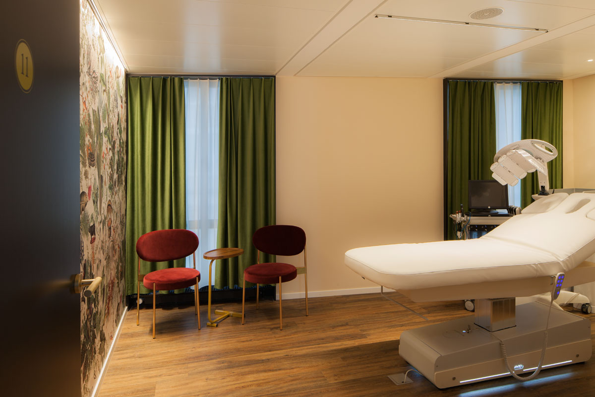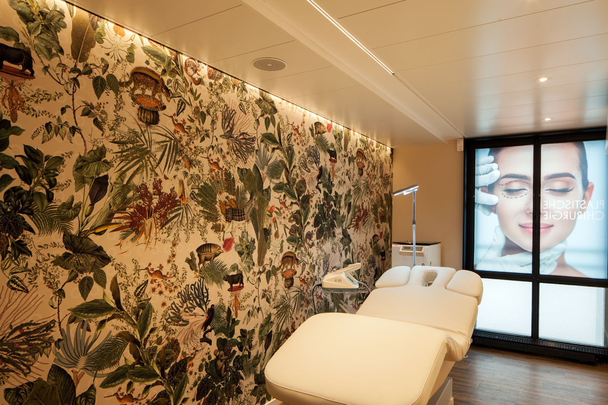 Das Thema Amazonien wird in den Behandlungszimmern durch eine stilvolle Tapete mit floralen und Tiermotiven aufgegriffen. Die ULTIMA-S ist eine Miniatur-LED-Leuchte und sorgt für eine homogene Ausleuchtung der exotischen Dschungelwelt und ihrer schönen Details.