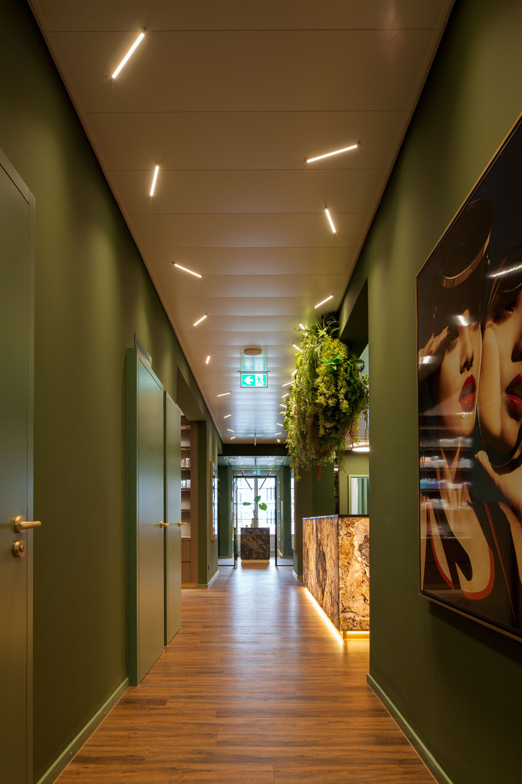 Auch im Gangbereich wurde die ULTIMA-S in asymmetrischer Form installiert. Der Beleuchtungseffekt dabei erzeugt ein dynamisches und zugleich harmonisches Lichtspiel, das eine einladende Atmosphäre schafft und den außergewöhnlichen Stil der Praxis hervorhebt.