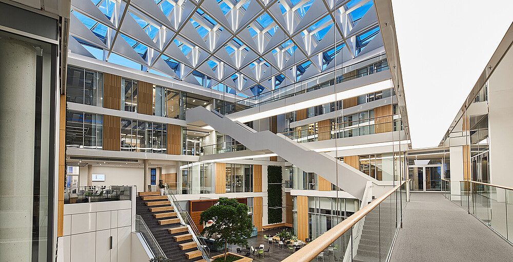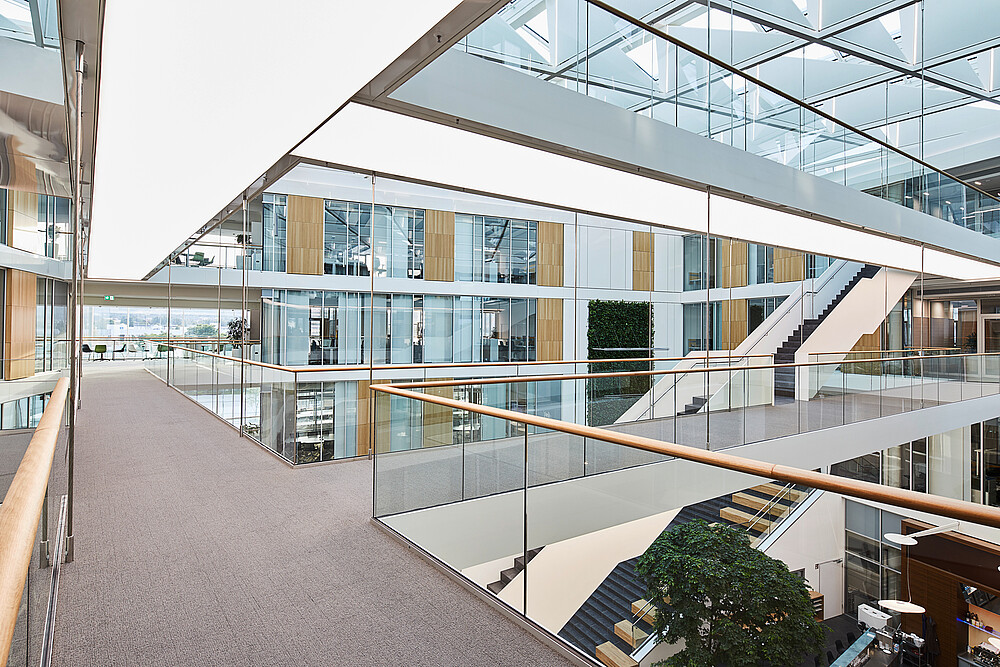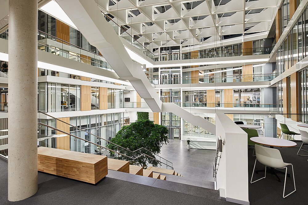 Das Herzstück des Gebäudes ist das Atrium, welches durch die einzigartige Architektur und dem bekräftigenden Lichtdesign, die wegweisende Innovationskraft des Unternehmens widerspiegeln soll.