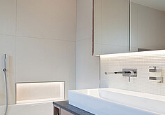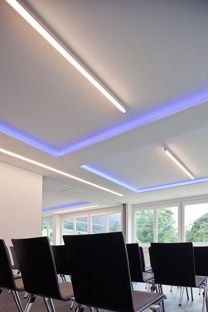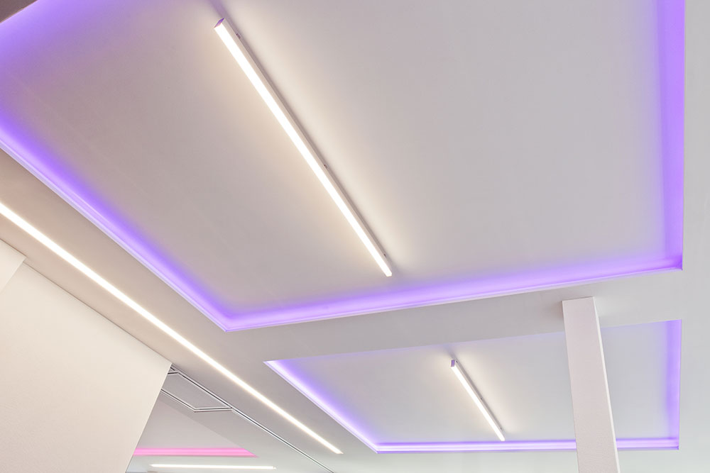 Um trotz niedriger Raumhöhen eine Lichtsituation zu schaffen, die sowohl ein gutes Arbeiten als auch eine stimmungsvolle Atmosphäre ermöglicht, setzte LIGHT ON zwei sich ergänzende Systemen ein. Das Hauptelement bilden lineare LED Leuchten mit opaler Abdeckung, die in einen Deckenschlitz eingelassen sind. Um die Decke aufzuhellen und den Deckenschlitz zugleich gleichmäßig auszuleuchten, sind die Bänder nur unmerklich aus der Aussparung hervorstehend. Zusätzlich werden die Deckenausschnitte, die den Raum optisch höher wirken lassen, durch nicht sichtbare LED-Bänder beleuchtet. Unterschiedliche Farbstimmungen sind bei dieser RGB-Lösung sind frei wählbar.