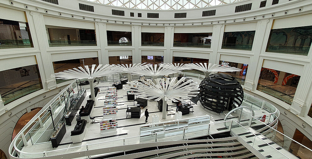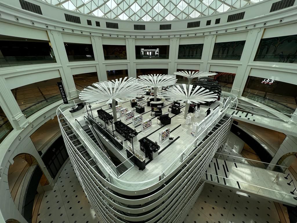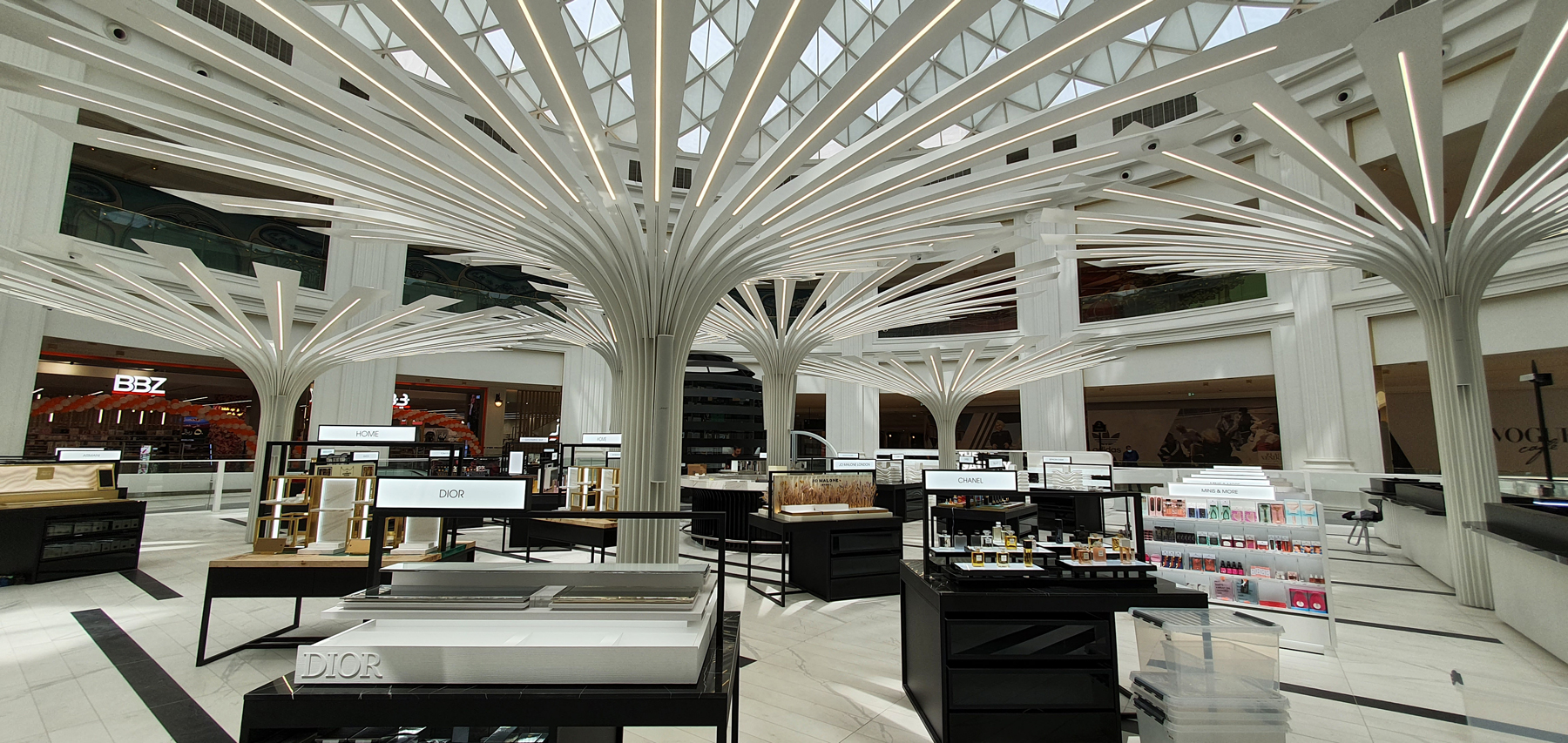 Der französische multinationale Einzelhändler für Kosmetikprodukte wollte ein ikonisches bauliches Meisterwerk in Katar schaffen: Das neue Geschäft befindet sich in einer großen Glaskuppelpassage und ist mit 3D-Streifen verkleidet, die das Außendesign auf eine ganz neue Ebene bringen.