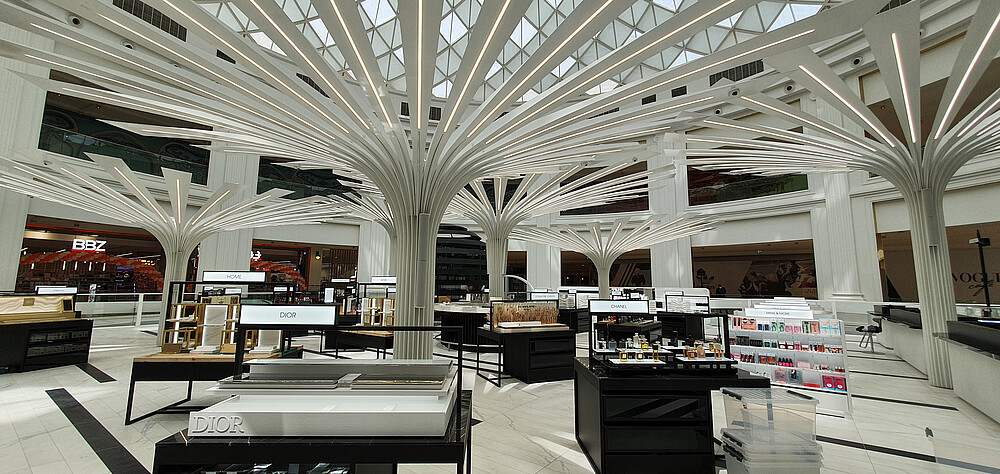 Auf der oberen Verkaufsfläche befinden sich außerdem Skulpturen, die in ihrer Form an Sonnenschirme erinnern. Diese Skulpturen sind mit der Designlichtline SKYLLA mit 3.000 Kelvin in der Top View-Variante ausgestattet, die das Tageslicht perfekt wiedergibt und die Verkaufsfläche auch in der Abenddämmerung zu einer besonderen Erlebniswelt aus Beautyprodukten verwandelt.