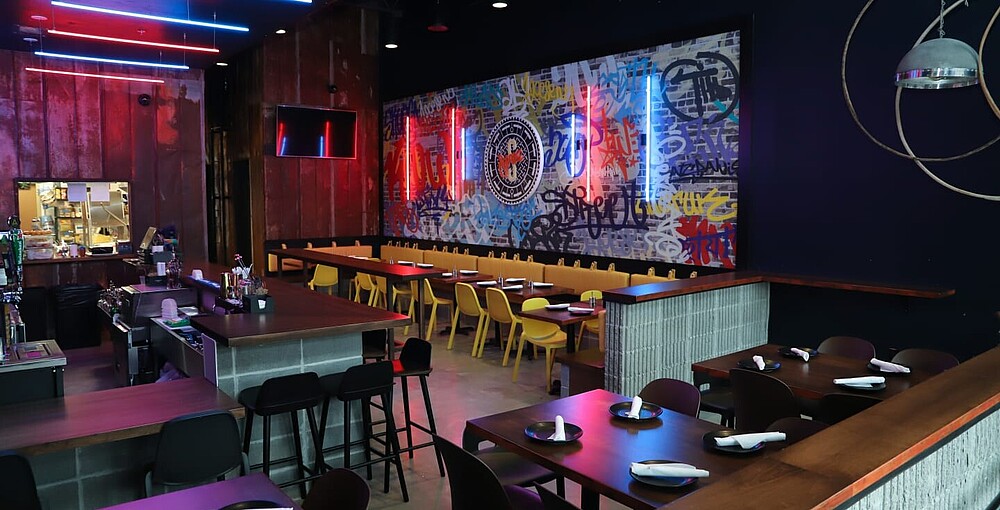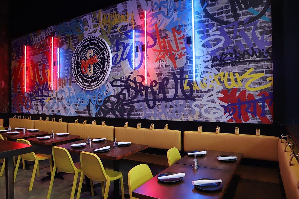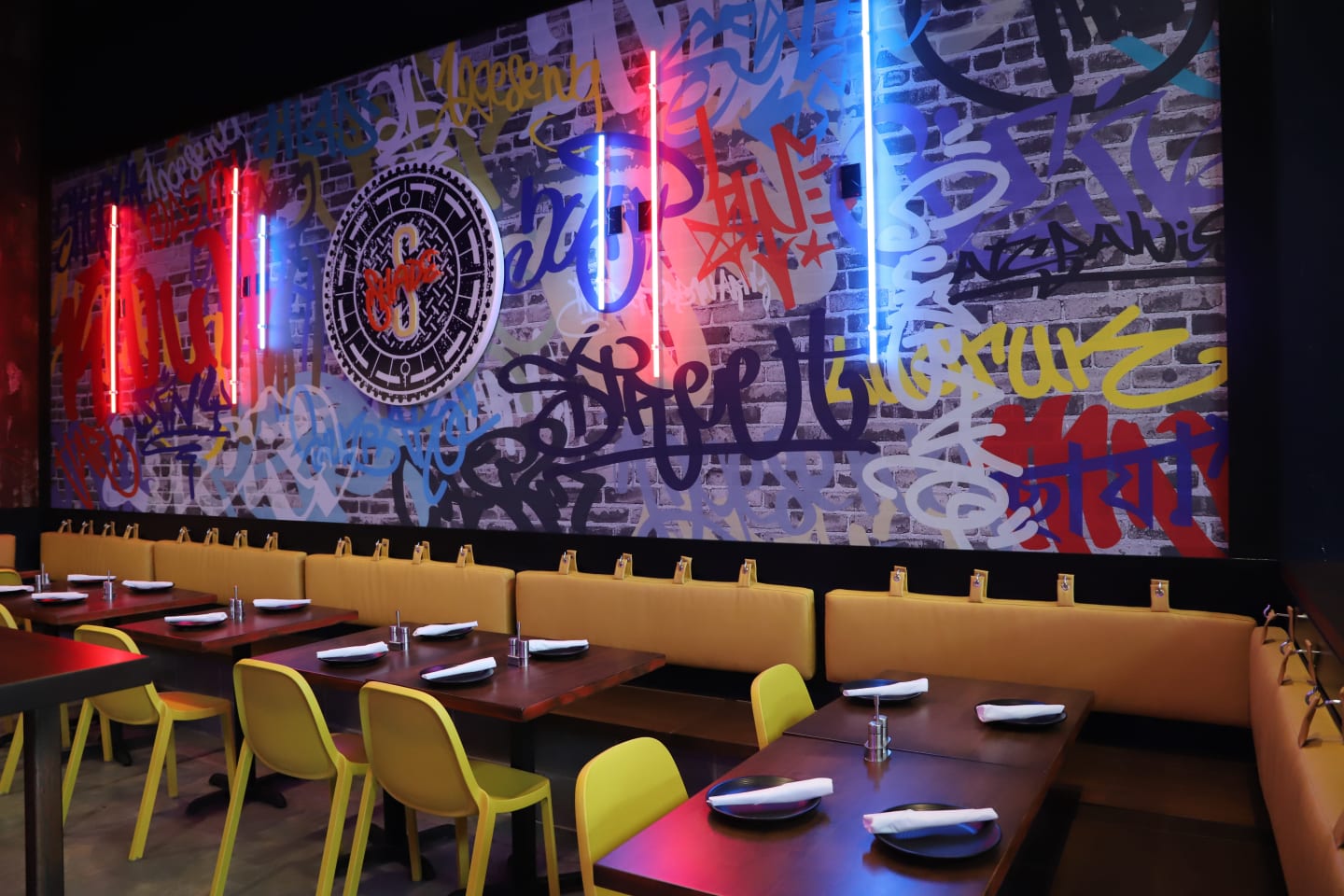 Shade Street Food & Bar wollte, dass das Interieur ihres Restaurants die geschmackvolle Speisekarte und die vielseitige, entspannte Umgebung widerspiegelt. Street Art trifft Street Food im Shade, wo ein kochinspiriertes kulinarisches Erlebnis mit einem Live-DJ und Tanz in die Nacht übergeht.