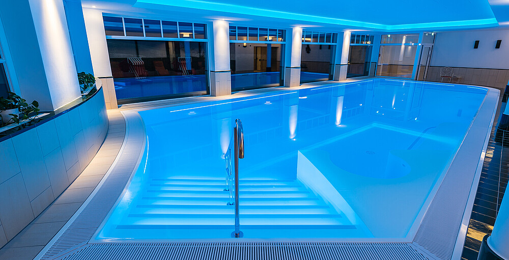 Das Hotel setzte bei dem Lichtdesign mit NEPTUNE auf homogene Lichtlinien, die sowohl an den Längsseiten des Pools als auch in den Treppenstufen eingesetzt wurden.