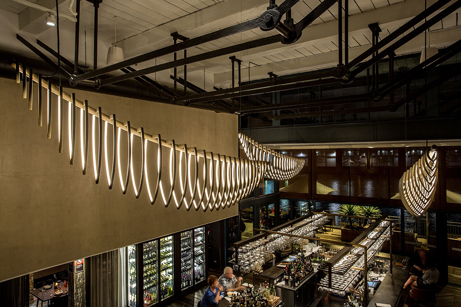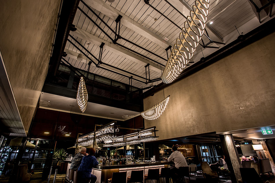 Vom Empfangsbereich wird der Blick auf die imposante Bar gelenkt, über der speziell angefertigte bootförmige Lichter schweben. Angeregt von der Atmosphäre des Ortes entwarf Electrolight diese kundenspezifische Lichtskulptur. Inspiration war die „organische Form und die Bewegung der Lebewesen des Ozeans und die Art und Weise wie moderne Yachten diese Bewegungen replizieren“. Die Arbeit, die den Namen „Squelette“ trägt, wurde vom Electrolight Sydney Team konzipiert und von Axolotl hergestellt.