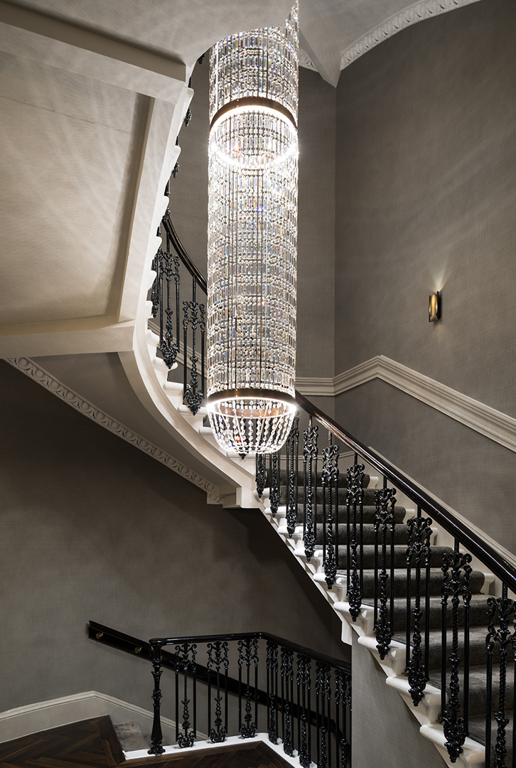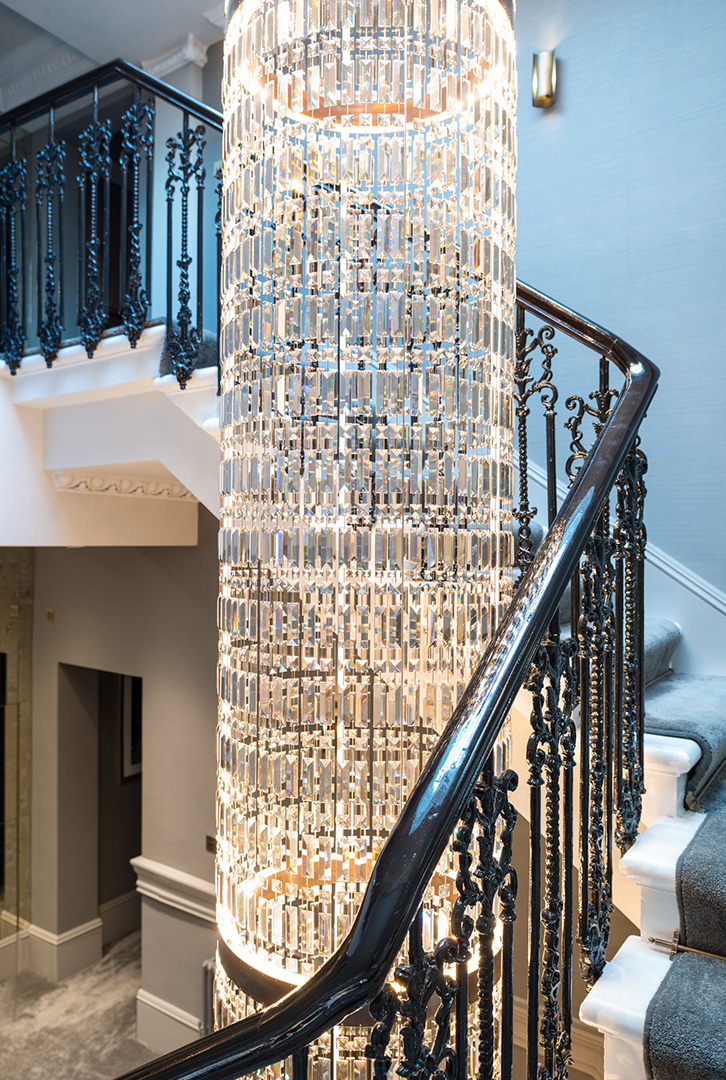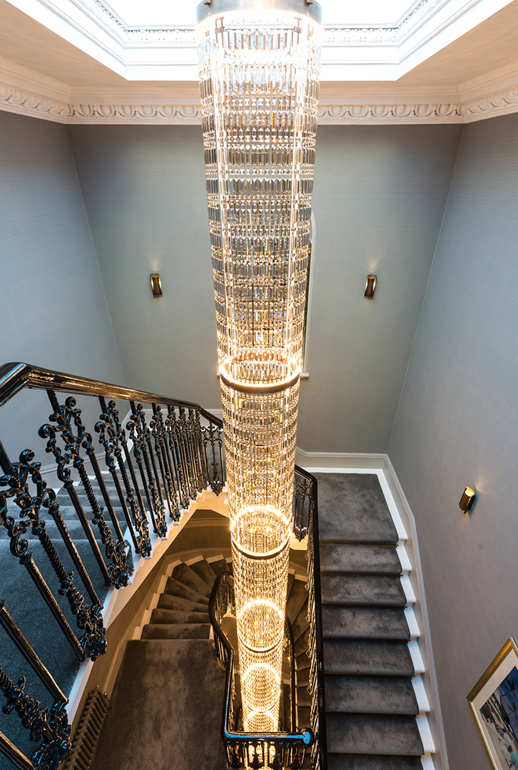 Der Xenia Kronleuchter wurde für ein wunderschön restauriertes historisches Stadthaus in Glasgow entworfen. Die Ästhetik des Leuchters reflektiert den zeitgenössischen Art-Deco-Stil des Inneren und erstreckt sich eindrucksvoll über die gesamte Länge des Treppenhauses.