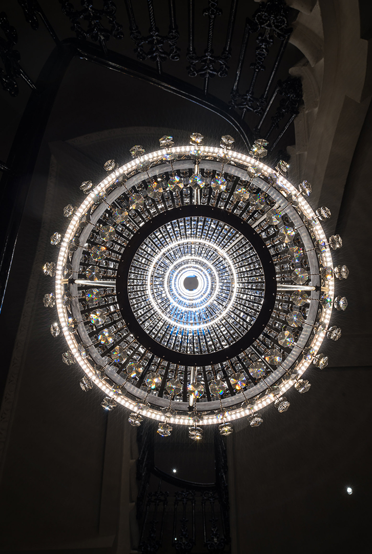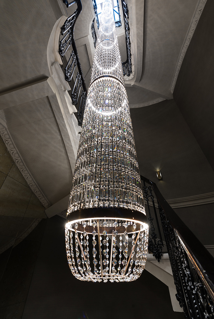 LED Linears flexibles LED-Band HYDRA HD10 W927 wurde verwendet, um den mit mehr als 10.000 langen Kristallen zusammengesetzten Kronleuchter mit einer Gesamtlänge von 14 Metern zu erleuchten. Die bronzefarbenen Pendelleuchten in Antikoptik und die grau-braune Farbgebung der Kristalle ergänzen die warme, gedämpfte Farbpalette des Interieurs ergänzen.